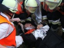 Am Samstag in der Früh um 7 Uhr ging es los. Der Tag ist wie in den vorhergegangenen Jahren wie bei der echten BF in einen engen Zeitplan eingeteilt. Als erstes wurden Jugendlichen per Los auf die Fahrzeuge verteilt und eingewiesen. Gleich danach fand eine kleine Übung zum Löschaufbau statt, die sich am Einsatzort später noch als wichtig erweisen sollte. Kurz nach der Übung rückte das BRK zum ersten Mal aus, eine Bewusstlose Person musste versorgt werden. Bald darauf rückte auch die „BF-Roßtal“ zu ihrem ersten Einsatz an diesem Tag aus: Eine eingeklemmte Person wartete auf ihre Befreiung. Nachdem der tonnenschwere Steinblock per Hebekissen und Seilwinde vom Verunfallten gestemmt wurde, konnte er dem BRK übergeben werden, die sich fürsorglich um ihren Patienten kümmerten.