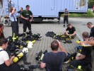 Innerhalb der ca. 20 Minuten im Container durfte jeder der Insgesamt acht Teilnehmer an das Strahlrohr um einen "Flashover" zu Bekämpfen. Hierbei muss die Richtung der Sprühstöße stimmen und die Wassermenge genau dosiert werden. Zuwenig, und die Flammen züngeln weiter - zuviel, und der Wasserdampf wird zur Gefahr. Nach dem Verlassen der Flammenhölle galt es, die Schutzkleidung korrekt abzulegen. So konnten die Helme gar nicht ohne Schutzhandschuhe abgenommen werden ohne Brandblasen zu riskieren. Bei mehreren hundert Grad Celsius im Container ist das auch verständlich.