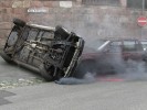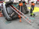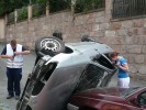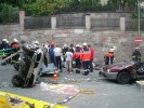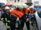 Parallel zum Brandherd (von Helmut Freitag aus dem Zugtrupp als Einsatzabschnittsleiter übernommen) musste sich der Kommandant Perzinger auch noch um den Verkehrsunfall kümmern: Zwei PKW waren zusammengestoßen, ein PKW lag auf der Seite und wurde von dem zweiten PKW gestützt. In jedem der Unfallwracks war ein Unfallopfer eingeklemmt, sodass in Absprache mit dem Notarzt Dr. Wolfschaffner eine patientengerechte Rettung durchgeführt werden musste: Das Dach des auf vier Rädern stehenden Fahrzeuges wurde abgenommen, der Patient konnte danach aus dem Fahrzeug gerettet und vom Rettungsdienst versorgt werden. Das auf der Seite liegende Auto stellte für die Hilfsorganisationen eine besondere Herausforderung dar, da es zunächst in der schrägen Position fixiert werden musste. Bei diesem Auto wurde das Dach einseitig aufgeklappt, sodass der zweite eingeklemmte Fahrer ebenso aus dem Wrack befreit und notärztlich versorgt werden konnte.