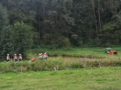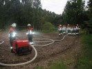 Die dortigen Gebäude machen im Ernstfall in Verbindung mit den zahlreichen Tieren die Brandbekämpfung nicht einfach. Hauptaugenmerk der Übung lag auf der Wasserversorgung, die an der angenommenen Einsatzstelle durch Wasserentnahmen aus nahe gelegenen Weihern ergänzt werden musste - diese Maßnahme war zwar sehr personal- und materialintensiv, führte aber zum gewünschten Ergebnis: Sogar das Wenderohr der Drehleiter mit einer enormen Durchflussmenge von 1600 Litern Wasser pro Minute konnte gespeist werden.