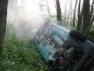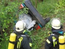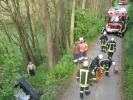 Der Übungsablauf - zu Beginn kam wie in Echt ein Fax aus dem Alarmdrucker - konzentrierte sich zunächst auf die Brandbekämpfung, ein Trupp unter umluftunabhängigem Atemschutz löschte den Pkw mit Schaum aus dem Hochdruckfeuerlöscher ab. Parallel dazu wurde der Pkw mit der Seilwinde des Rüstwagens gesichert - denn auch kleine Bewegungen des Pkws könnten das Fahrzeug mehrere Meter in die Tiefe rutschen lassen. Da kein adäquater Zugang zum Fahrzeug (z. B. über die Türe) möglich war, musste das Dach entfernt werden. Anschließend konnte der Dummy möglichst achsengerecht (damit Verletzungen an der Wirbelsäule nicht verschlimmert werden) mittels Schaufeltrage aus der Zwangslage befreit werden.