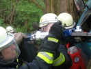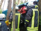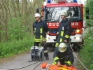 Daher üben die Kameradinnen und Kameraden der Feuerwehr Roßtal unter möglichst realistischen Bedingungen. Wenn auch teilweise extreme Situationen angenommen werden, so sind diese keinesfalls unrealistisch - wie zum Beispiel ein Pkw, der am Sportplatzweg den Abhang hinunterschlittert und auf der Seite an einem Baum lehnend zum Stillstand kommt.
