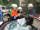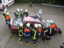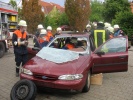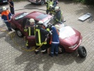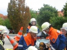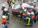 Ein komplettes Verkehrsunfallszenario haben die Jugendwarte Stefan Oppelt und Steffen Freitag auf dem Feuerwehrhof aufgebaut: Aus einem verunfallten PKW musste ein Dummy mit schwerem Rettungsgerät befreit werden.