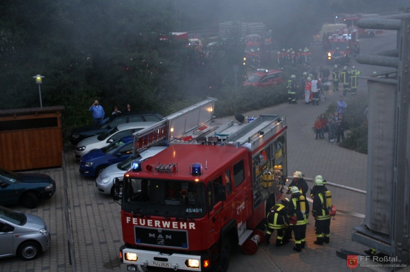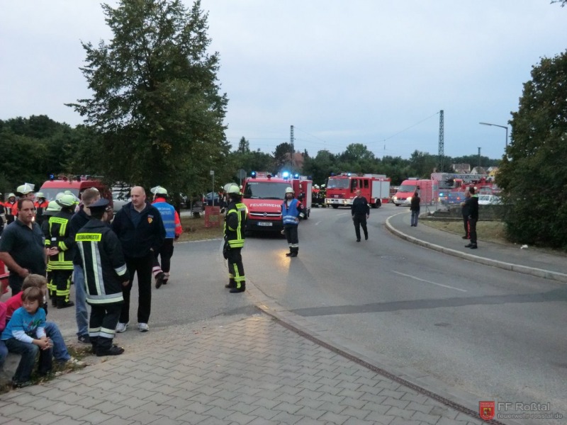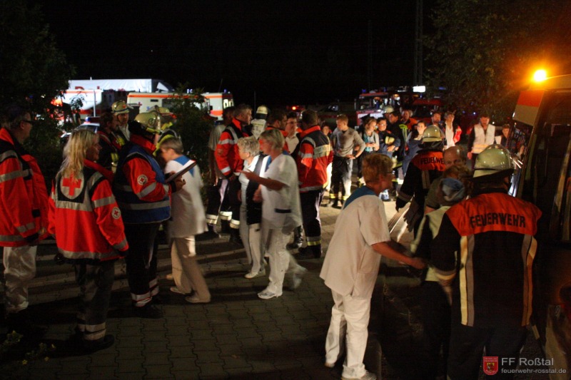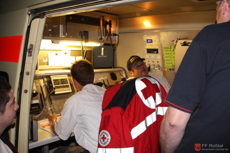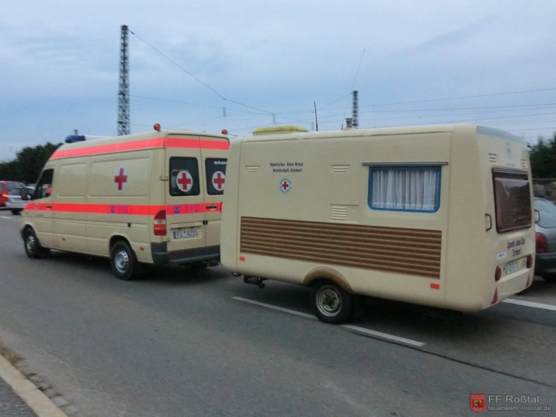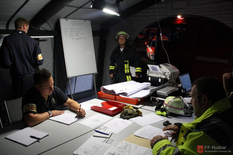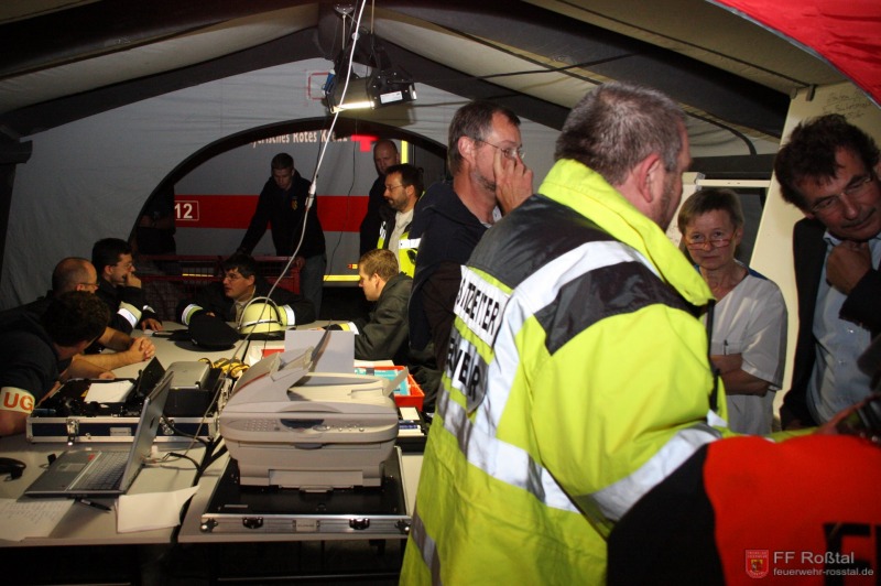 Die Unterstützungsgruppe der Sanitäts-Einsatzleitung hat auf eigene Entscheidung in einiger Entfernung zur Feuerwehr-Einsatzleitung Aufstellung bezogen