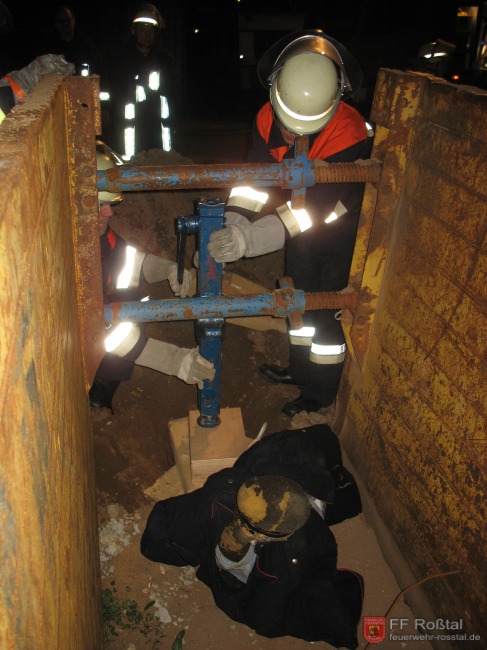 Bild 3 von 8 Eine eingeklemmte Übungspuppe wird im Rahmen der Tiefbau-Unfall-Praxis mittels hydraulischer Winde befreit