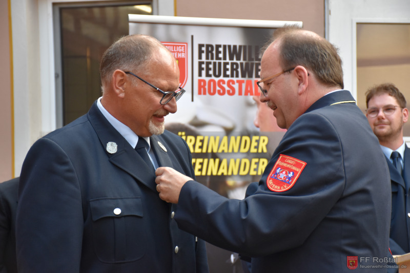 Bezirksvorsitzender des Feuerwehrverbandes Holger Heller bei der Überreichung des Ehrenkreuzes in Silber vom LFV