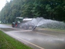 Auf der B 14 im Bereich der Ausfahrten Defersdorf bzw. Wimpashof musste eine rutschige, stellenweise zentimeterdicke Schmutzschicht von der Straße weggewaschen werden.