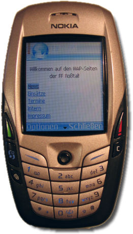 Um sich auch Unterwegs über uns informieren zu können, stellen wir WAP Seiten für Mobile Endgeräte zur Verfügung. Heutzutage besitzt jedes Handy einen entsprechenden WAP-Browser, mit dem Sie auf die Seiten zugreifen können. Momentan finden sie dort die aktuellen News, Termine und Einsätze. Im internen Bereich für Mitglieder befinden sich ein Telefon- und Adressvereichnis und weitere nützliche Dinge.
